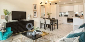 Plot 105 is a spacious third-floor 2-bedroom apartment in Barton Apartments, Eastman Village. Spanning 642 sq ft, this dual-aspect home is filled with natural light and offers views over the landscaped courtyard. The open-plan living area seamlessly integrates with a fully fitted kitchen featuring high-specification appliances, creating an ideal space for relaxing or entertaining. The apartment also includes two double bedrooms, a modern bathroom, and ample storage solutions.
